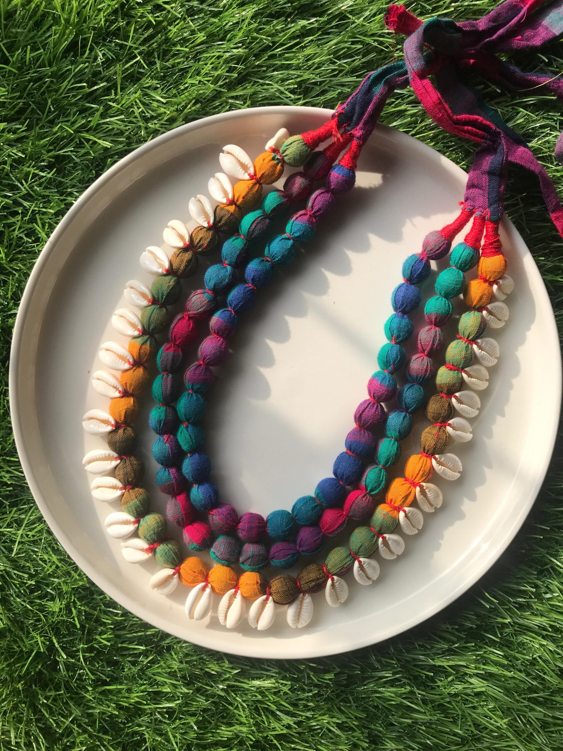 Make a bold statement with this handcrafted 3 Layer Tarsels Necklace adorned with natural shells. A perfect fusion of tradition and coastal charm, exclusively from Charul Jewellers