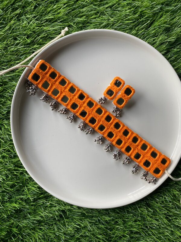This unique jewelry piece is carefully handcrafted with premium quality fabric, small square mirrors, and adorned with silver ghungroo charms that give a festive and graceful touch.