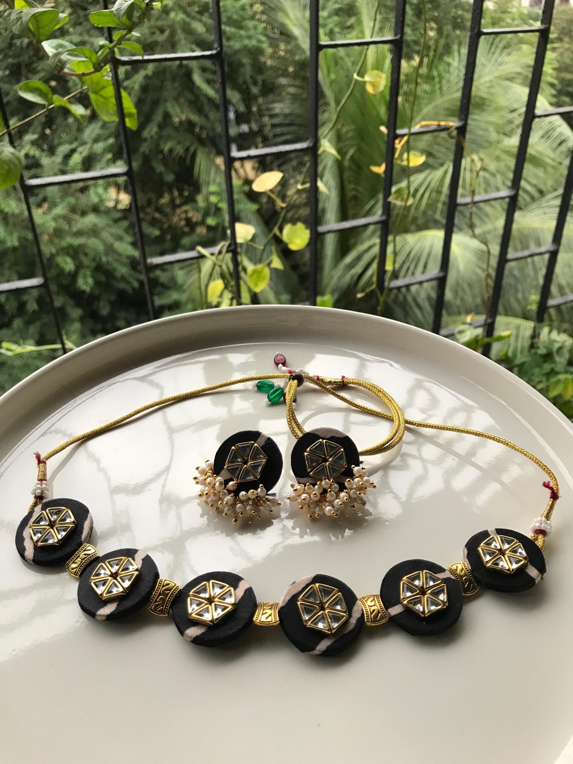 + Free Shipping| Gajji Silk Lariya Print Kundan Choker With Loreals Studs | Black, Red |
